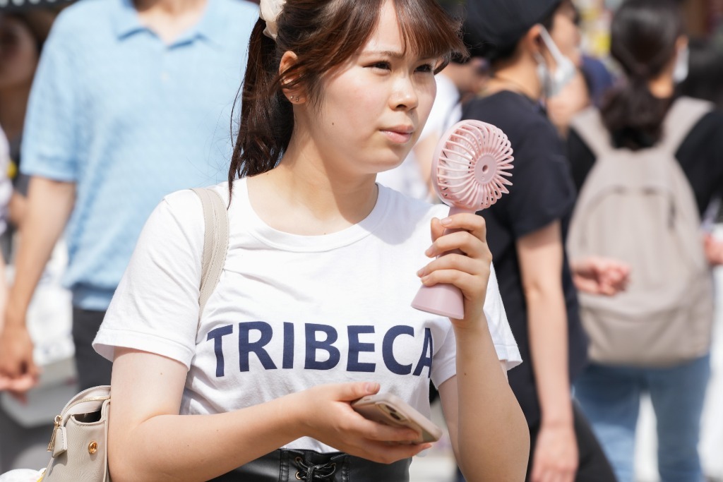 6月29日,一名手持便攜風(fēng)扇的女子走在日本東京澀谷街頭。新華社記者張笑宇攝