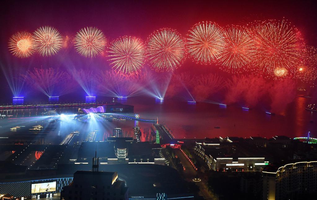 這是上合組織青島峰會(huì)期間舉行的《有朋自遠(yuǎn)方來(lái)》燈光焰火藝術(shù)表演。新華社記者 李紫恒 攝