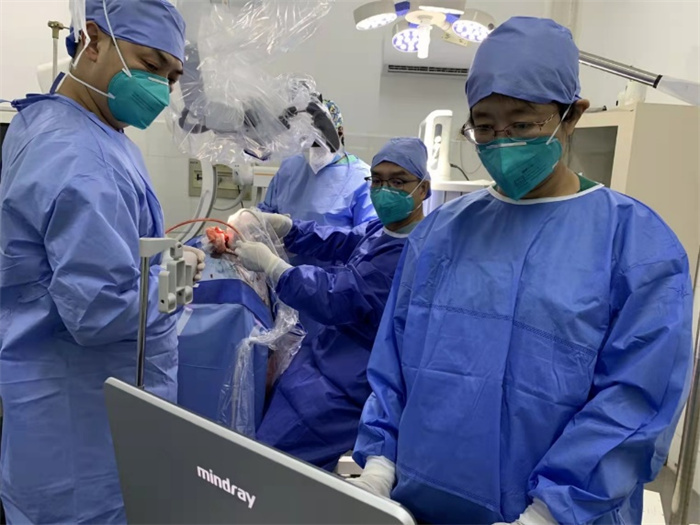 7月3日上午,中國醫(yī)療隊在中幾友好醫(yī)院成功完成了一例顯微鏡下功能區(qū)腦膿腫切除術(shù)。以往患者罹患腦部病變大多只能選擇去國外接受手術(shù)治療,而這位50歲的幾內(nèi)亞患者因病情較重,無法承受長途旅行,在聽聞中幾友好醫(yī)院已成功開展多例顱腦腫瘤顯微手術(shù)后,決定在此治療,由中國第29批援幾內(nèi)亞醫(yī)療隊的神經(jīng)外科專家張國濱實施手術(shù)。