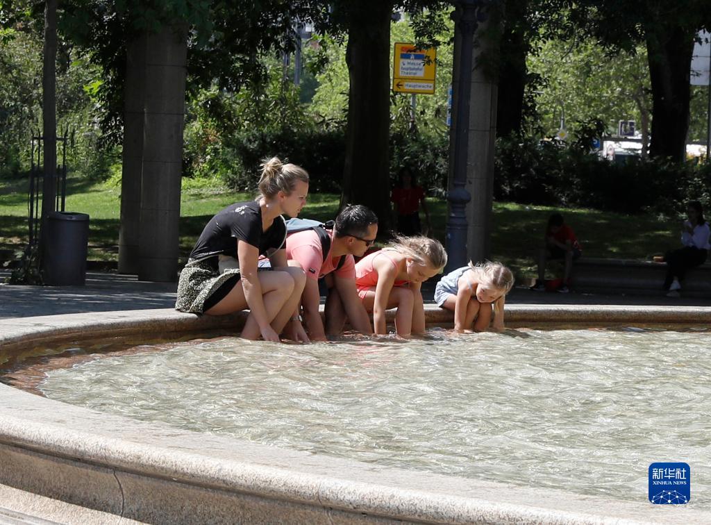 7月8日,人們在德國法蘭克福的一處噴泉玩水。近日,德國法蘭克福逐漸迎來暑熱天氣。新華社記者 張帆 攝