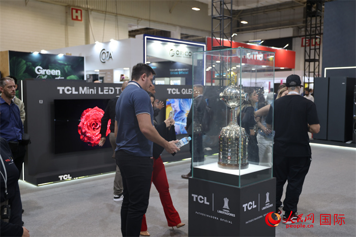 參觀者在TCL展臺前觀看南美解放者杯獎杯,據(jù)介紹,TCL是南美解放者杯(2023—2026賽季)全球官方合作伙伴。人民網(wǎng)記者 時元皓攝