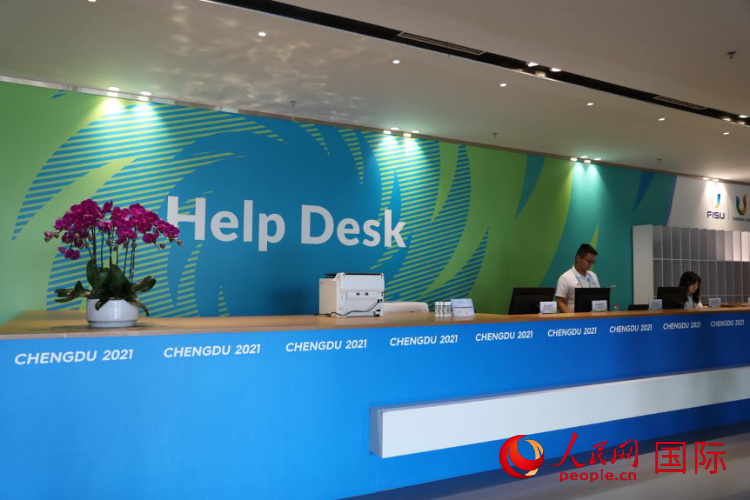 成都大運(yùn)會主媒體中心服務(wù)臺。人民網(wǎng)記者 符園園攝 |