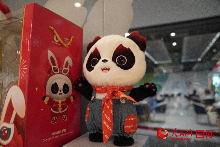 成都大運(yùn)會主媒體中心官方特許商品零售店的“蓉寶”公仔。人民網(wǎng) 周琳佳攝 |
