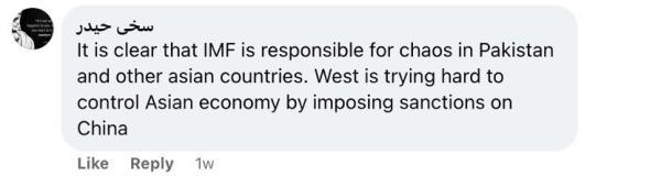 還有網(wǎng)友留言說:“國(guó)際貨幣基金組織對(duì)巴基斯坦和其他亞洲國(guó)家的混亂負(fù)有責(zé)任,這一點(diǎn)再清楚不過了。西方試圖通過制裁中國(guó)來控制亞洲經(jīng)濟(jì)?!?/p>