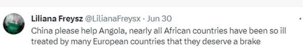 網(wǎng)友利利安娜·弗賴斯直呼:“中國(guó)請(qǐng)幫助安哥拉,幾乎所有非洲國(guó)家都忍受過歐洲國(guó)家的糟糕對(duì)待,它們?cè)撚瓉磙D(zhuǎn)機(jī)了?!?/p>