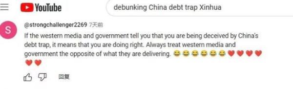 網(wǎng)友“強(qiáng)力挑戰(zhàn)者2269”直言:“如果西方政府和媒體告訴你,你陷入了中國(guó)的‘債務(wù)陷阱’,那證明你做對(duì)了。對(duì)待西方媒體和政府宣傳的信息,你得反著看?!?/p>