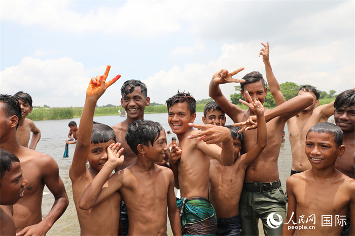 在孟加拉國首都達卡東南郊區(qū)的達舍爾甘地村,一片片池塘和河流形成密布的水系,當?shù)睾⒆觽儽M情地跳進清澈的河水中嬉戲玩耍??吹接浾叩溺R頭,他們興奮地展示著自己的泳技,有的展臂向前游動、有的騰身躍入水中,一大群孩子聚在鏡頭前,齊聲高喊:“我愛游泳,我愛茍加芮Gojaria河,我愛中國?!?/p>