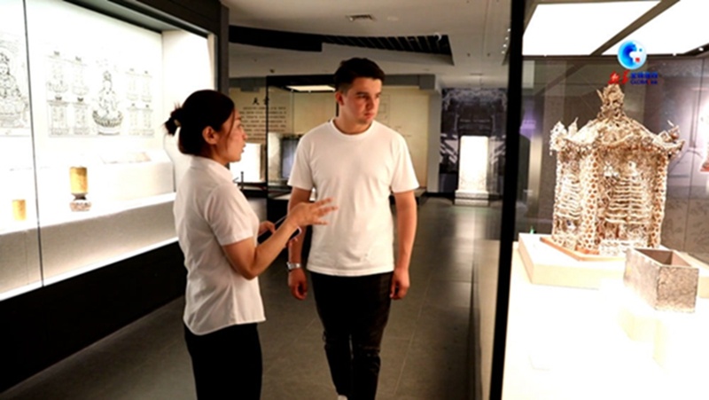 塔吉克斯坦留學(xué)生包伯仲在朝陽市北塔博物館館長(zhǎng)王志華的帶領(lǐng)下,游覽北塔一睹國寶級(jí)文物的風(fēng)采。