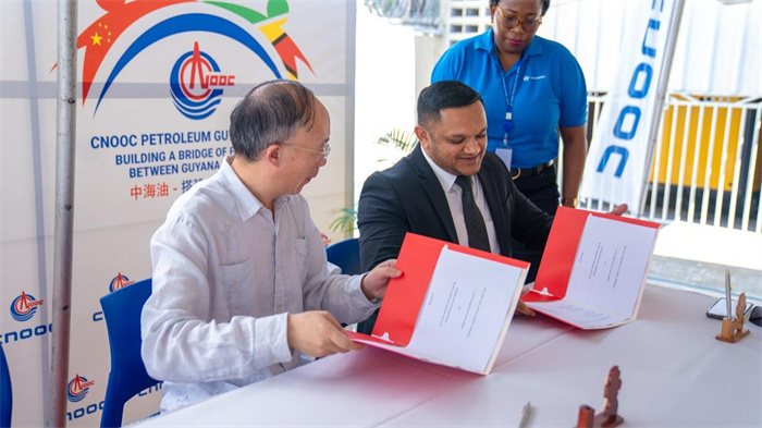 圭亞那自然資源部部長巴拉特與中海油圭亞那有限公司總經理劉曉祥在協(xié)議上簽字。中海油圭亞那有限公司供圖