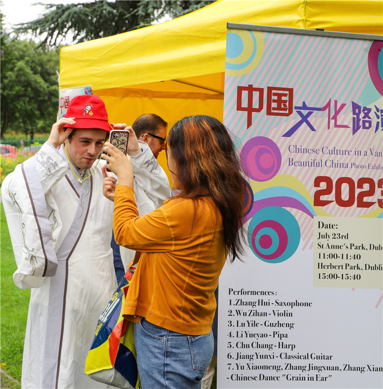 華僑華人文藝團(tuán)隊利用移動舞臺“大篷車”在都柏林圣安妮公園和赫伯特公園巡演,為當(dāng)?shù)孛癖妿砹斯殴~、琵琶等音樂及舞蹈表演,并安排了漢服展示及試穿環(huán)節(jié),觀眾們紛紛興致勃勃地試穿漢服。“美麗中國”圖片展展出了幾十幅介紹中國自然環(huán)境和人文景觀的照片,吸引了不少游客駐足。