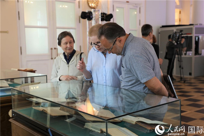 中俄圖書館論壇嘉賓共同參觀由俄羅斯國立列寧圖書館舉辦的館藏中國古籍善本圖書展。人民網(wǎng)記者 隋鑫攝