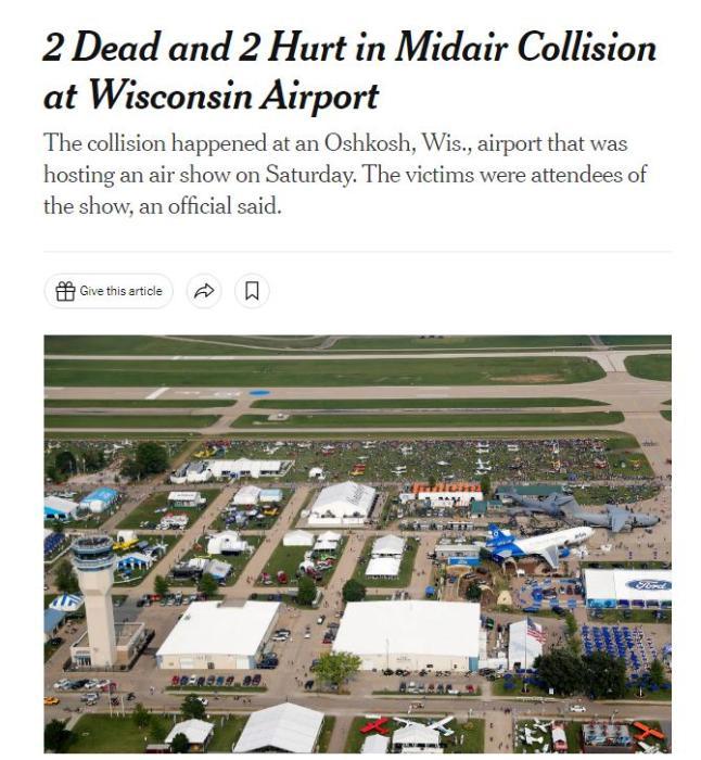 據(jù)《紐約時(shí)報(bào)》報(bào)道,美國(guó)聯(lián)邦航空管理局(FAA)稱(chēng),事故發(fā)生在威斯康星州奧什科什的惠特曼地區(qū)機(jī)場(chǎng)。在為期一周的活動(dòng)中,“實(shí)驗(yàn)飛機(jī)協(xié)會(huì)”在此舉辦飛行表演和航展。