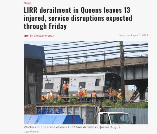 報(bào)道稱,當(dāng)?shù)毓賳T介紹,這列隸屬于長島鐵路公司的火車從紐約市中央車站出發(fā),在行至皇后區(qū)牙買加車站附近時(shí)發(fā)生事故,所掛八節(jié)車廂全部脫軌。