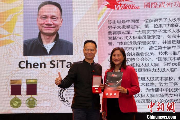 8月7日,加拿大聯(lián)邦眾議員葉嘉麗(右)向來自中國(guó)的太極名家陳思坦頒授國(guó)際武術(shù)功夫名人堂勛章?!≈行律缬浾?余瑞冬 攝