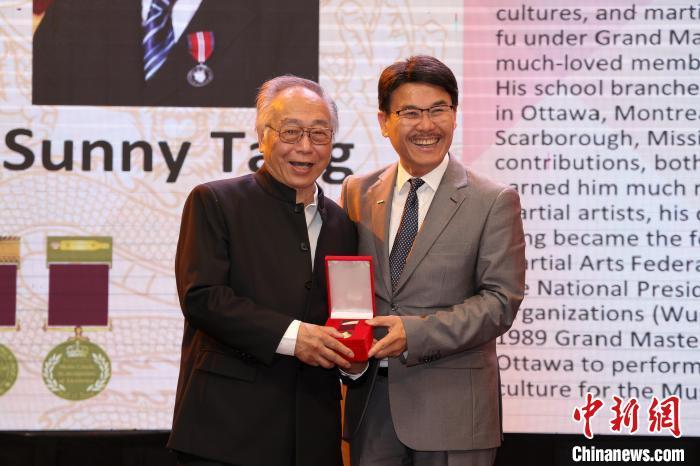 7日,國(guó)際武術(shù)聯(lián)合會(huì)執(zhí)行委員、加拿大武術(shù)團(tuán)體聯(lián)合總會(huì)會(huì)長(zhǎng)鄧華(左)獲頒國(guó)際武術(shù)功夫名人堂勛章。中新社記者 余瑞冬 攝