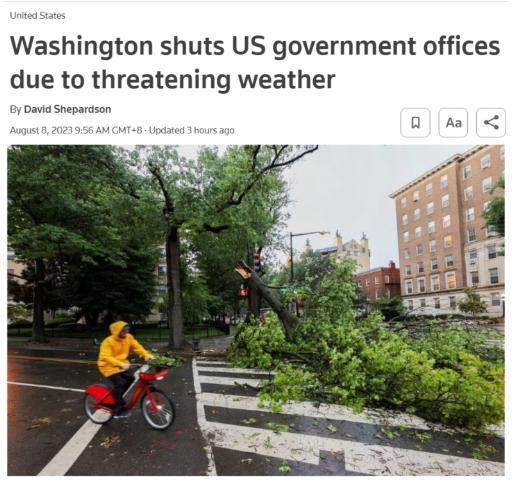 中新網(wǎng)8月8日電 據(jù)路透社報(bào)道,當(dāng)?shù)貢r(shí)間7日,美國華盛頓地區(qū)出現(xiàn)雷暴天氣,當(dāng)?shù)卣k公機(jī)關(guān)提早關(guān)閉。美東地區(qū)的居民還接到警告稱,可能出現(xiàn)龍卷風(fēng)、破壞性強(qiáng)風(fēng)和冰雹。