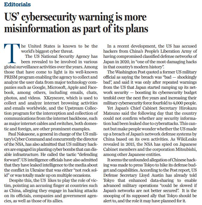 原標(biāo)題:US' cybersecurity warning is more misinformation as part of its plans