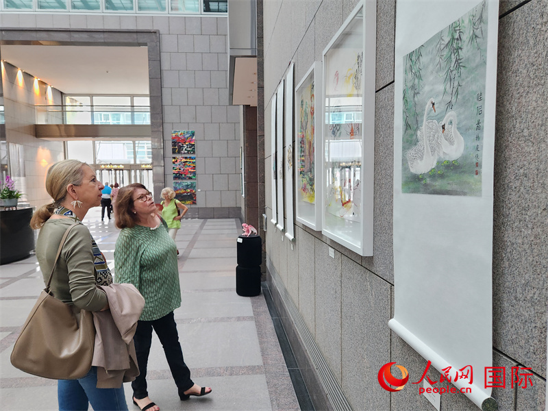 現(xiàn)場(chǎng)嘉賓在欣賞藝術(shù)展作品。人民網(wǎng)記者 劉仲華攝 |