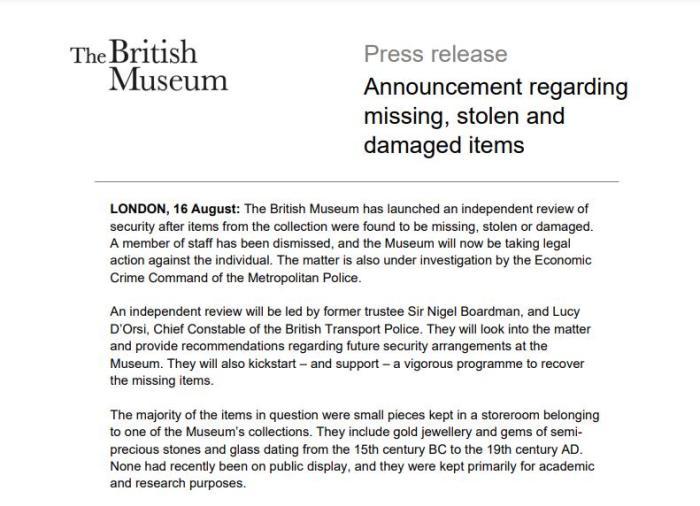 藏品丟失的具體時(shí)間沒有說明,但據(jù)大英博物館董事會(huì)董事長喬治·奧斯本表示,董事會(huì)成員在“今年早些時(shí)候”得知此事,非常擔(dān)憂。
