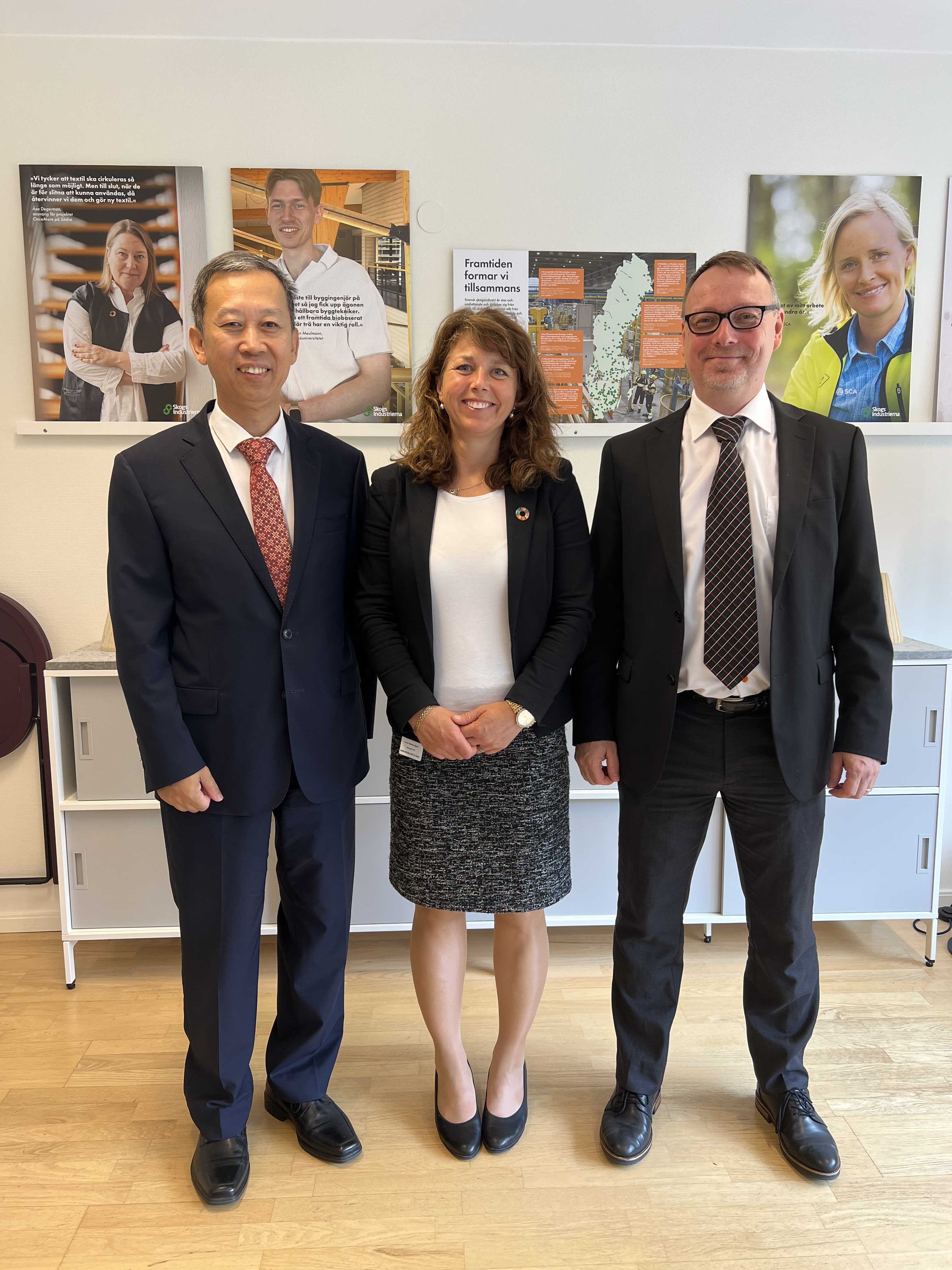 中國駐瑞典大使崔愛民(左一)與瑞典木業(yè)協(xié)會會長奧格林和前任會長福里德霍爾姆合影。中國駐瑞典大使館供圖