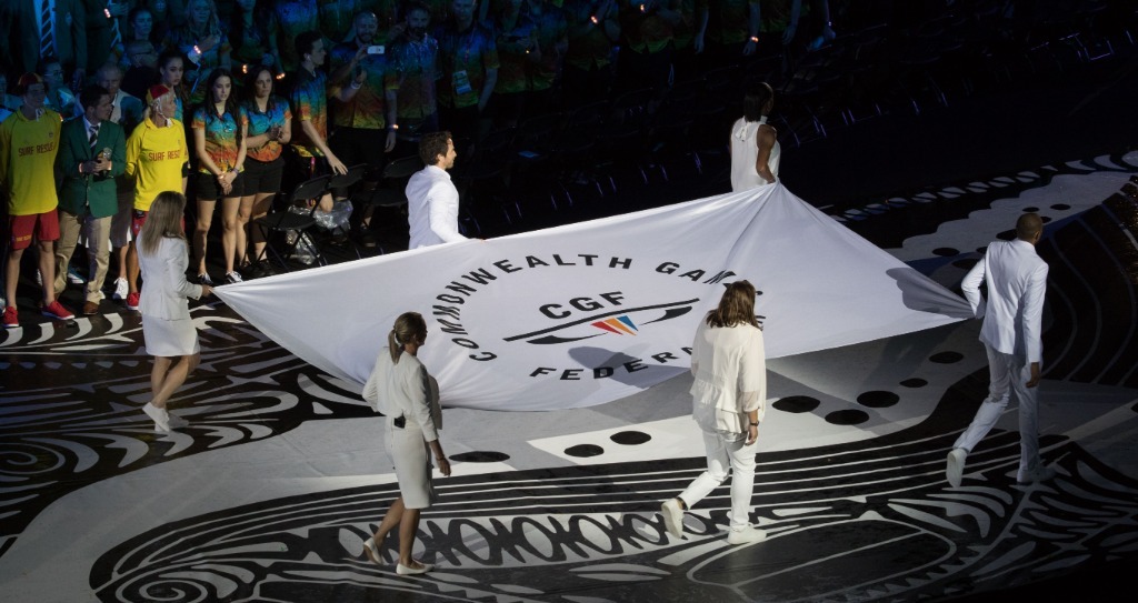 2018年4月4日,護旗手手持英聯(lián)邦運動會會旗入場。當日,2018年英聯(lián)邦運動會開幕式在澳大利亞黃金海岸舉行。新華社發(fā)(朱宏業(yè)攝)