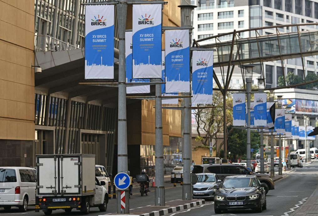 這是8月17日在南非約翰內斯堡拍攝的金磚國家領導人會晤條幅。(新華社記者陳誠攝)