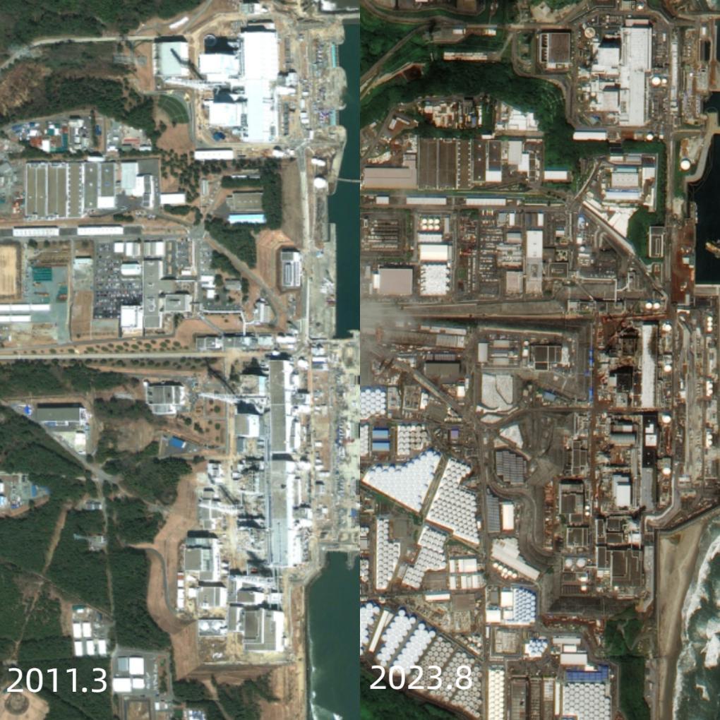 下圖為福島第一核電站衛(wèi)星影像對比圖,從對比中可以明顯看到,2011年3月11日的地震后,日方在廠區(qū)內(nèi)修建了密密麻麻的圓形核污染水儲水罐。