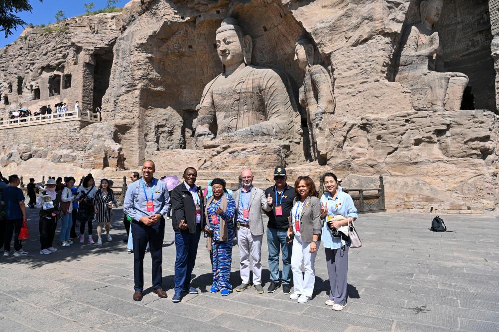 9月4日,駐華使節(jié)們在云岡石窟合影留念。新華社記者 楊晨光 攝