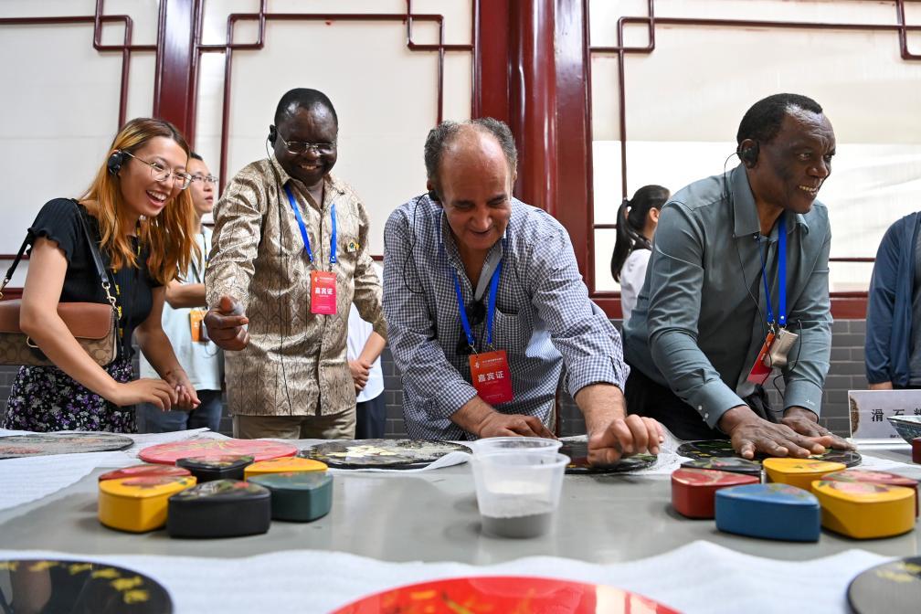 9月7日,使節(jié)們在平遙古城體驗推光漆器制作。新華社記者 楊晨光 攝