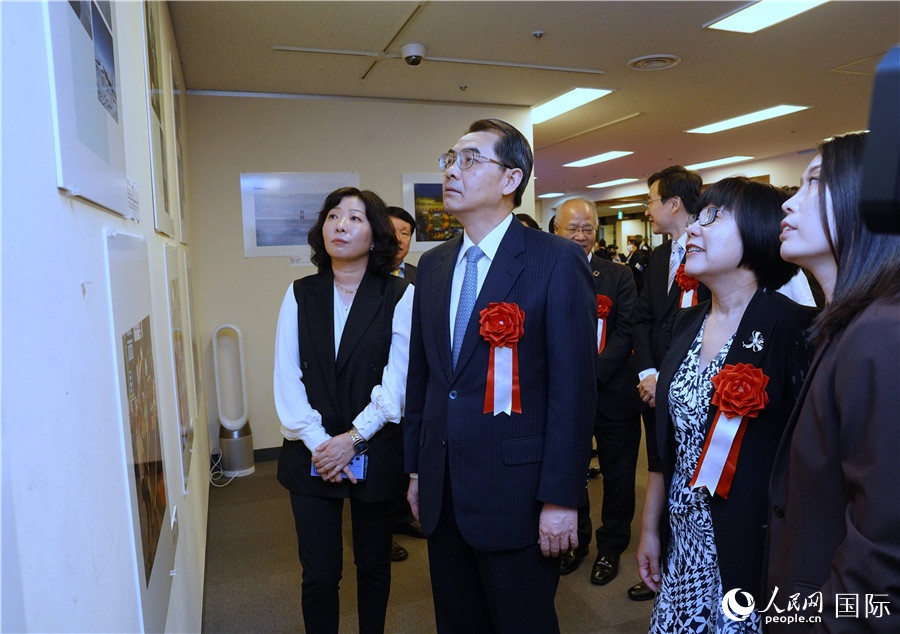 人民網(wǎng)監(jiān)事會主席唐維紅向中國駐日大使吳江浩介紹展出作品。人民網(wǎng) 許可攝 |