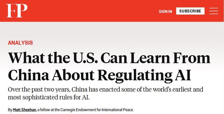 文章寫道,中國在過去兩年中頒布了一些全球前所未有的、最完善的人工智能監(jiān)管法規(guī)。