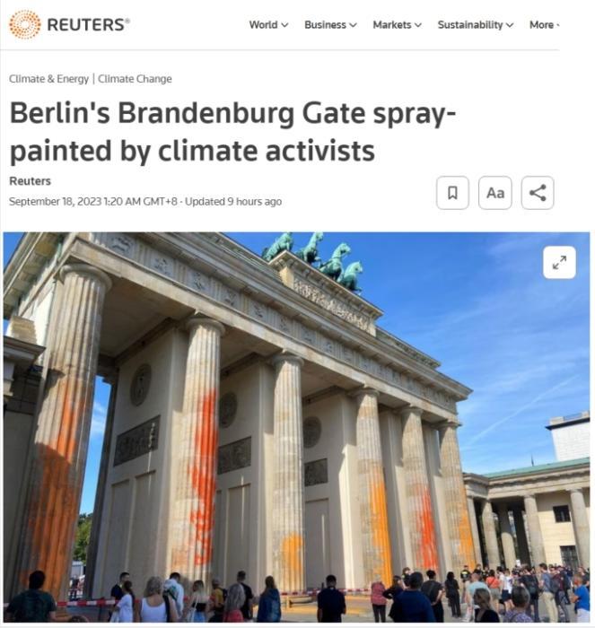 中新網(wǎng)9月18日電 據(jù)路透社報(bào)道,當(dāng)?shù)貢r(shí)間17日,德國首都柏林地標(biāo)建筑勃蘭登堡門的立柱被名為“最后一代”的環(huán)保團(tuán)體成員噴灑黃色和橙色顏料,警方在現(xiàn)場逮捕了14名肇事者。