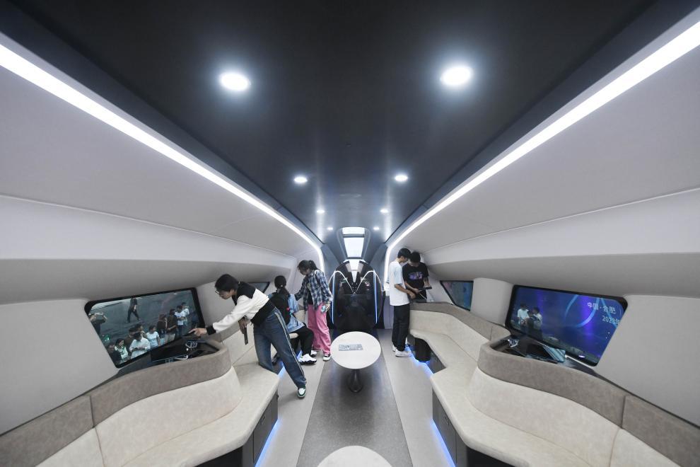 9月20日,在2023世界制造業(yè)大會(huì)上,觀眾近距離了解時(shí)速600公里高速磁浮交通系統(tǒng)。新華社記者 張端 攝
