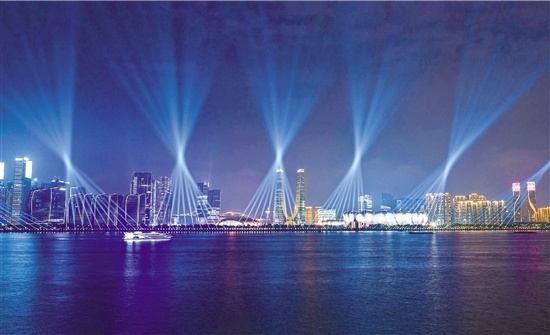 連日來(lái),杭州奧體中心場(chǎng)館群璀璨奪目的燈光秀,將迎接亞運(yùn)的氛圍拉滿。記者 梁臻 姚穎康 拍友 余文華 攝