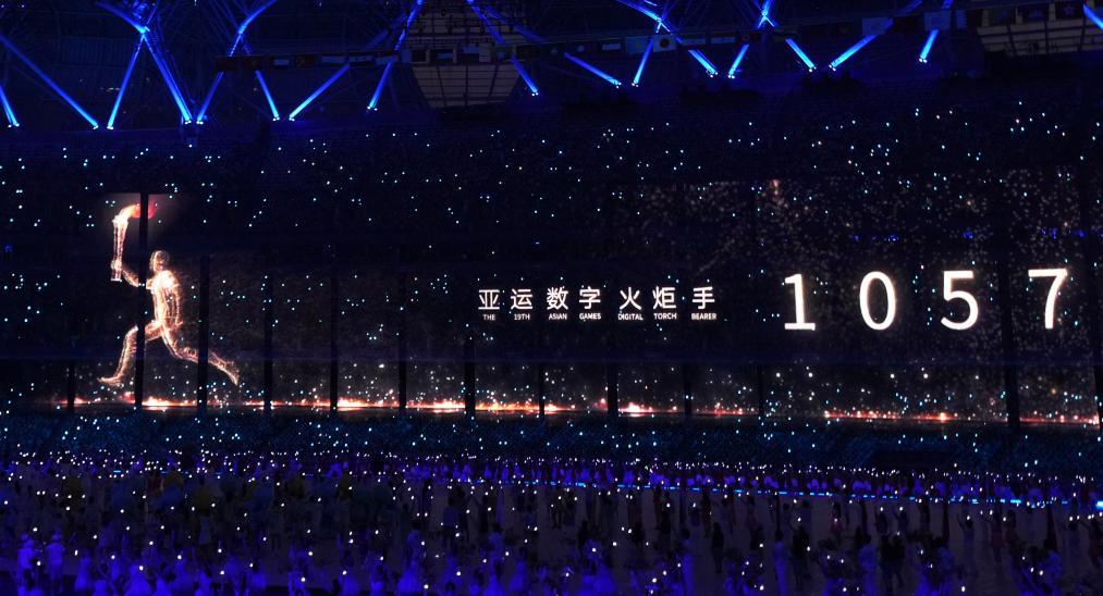 9月23日,“數(shù)字火炬手”在開幕式上進行火炬?zhèn)鬟f。新華社記者 杜宇 攝