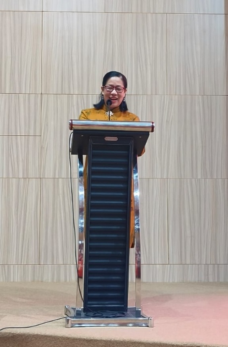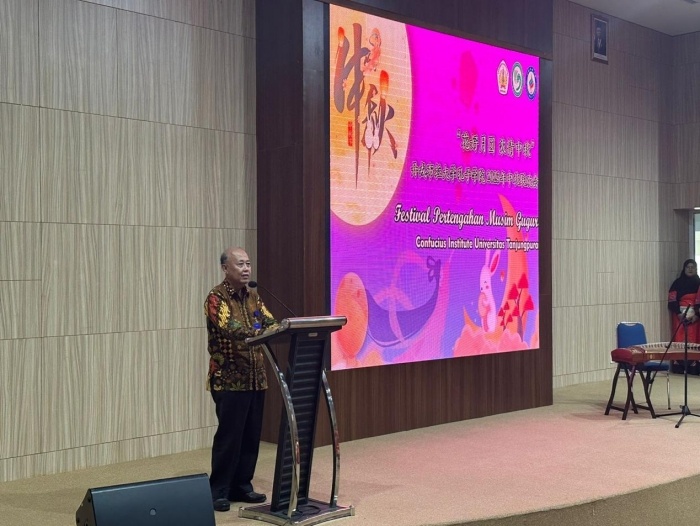 印尼丹戎布拉大學(xué)孔子學(xué)院中方院長周桂致辭。丹戎布拉大學(xué)供圖 |