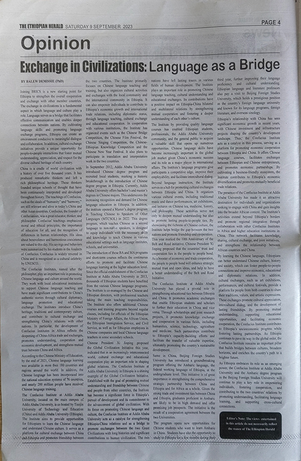 人民網(wǎng)開羅9月25日電 (記者沈小曉)近日,埃塞俄比亞政策研究院研究員、亞的斯亞貝巴大學(xué)副教授巴盧·德米西在埃塞官方第一大報《埃塞先驅(qū)報》上撰文,以《文明交流:語言為橋》為題發(fā)表整版文章。文章提到,“加入金磚國家大家庭是埃塞俄比亞加強與其他成員國全面合作與交流的新起點。文明間的交流是基礎(chǔ),語言和文化在其中起著重要作用。語言是促進國與國之間有效溝通、加強聯(lián)系的橋梁?!?/p>
