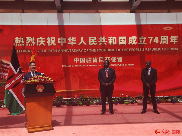 人民網(wǎng)內(nèi)羅畢9月27日電 (記者黃煒鑫)27日,中國(guó)駐肯尼亞大使館舉辦招待會(huì),熱烈慶祝中華人民共和國(guó)成立74周年。中國(guó)駐肯尼亞大使周平劍,肯尼亞內(nèi)閣首席部長(zhǎng)穆達(dá)瓦迪、國(guó)民議會(huì)副議長(zhǎng)舍萊伊等各界人士,外國(guó)駐肯尼亞使節(jié),中資機(jī)構(gòu)和華僑華人等600余人出席。