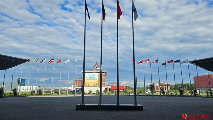 中白工業(yè)園內(nèi),多國國旗飄揚。園區(qū)已有來自16個國家和地區(qū)的企業(yè)入駐。人民網(wǎng)記者 朱虹攝