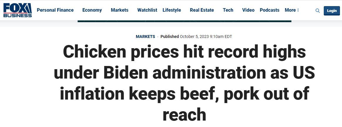 另據(jù)美國福克斯商業(yè)頻道(Fox Business)網(wǎng)站報道,受到持續(xù)通貨膨脹影響,美國牛肉和豬肉價格保持高位,普通消費者不得不轉(zhuǎn)向略微便宜一些的雞肉。然而,全美零售店的雞肉價格也隨著需求量的增加而水漲船高,更是創(chuàng)下歷史新高,并且預(yù)計還將保持在高位。