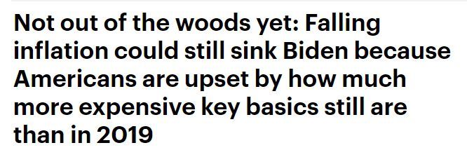 報道援引美國數(shù)字新聞網(wǎng)站(Axios)的民調(diào)稱,美國民眾對本國經(jīng)濟(jì)的看法十分糟糕。這其中很重要的原因就是,民眾在日常生活中更關(guān)注所需商品的絕對價格,而這一價格目前依然過高。盡管近期美國通脹率有所下降,但商品價格還在上漲,只是比以前稍慢了一些。