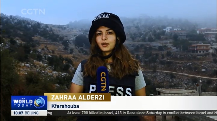 總臺報道員扎赫拉·阿爾德齊,在黎巴嫩和以色列臨時邊界附近的卡夫喬巴,現(xiàn)場報道黎巴嫩真主黨和以色列發(fā)生交火的情況。