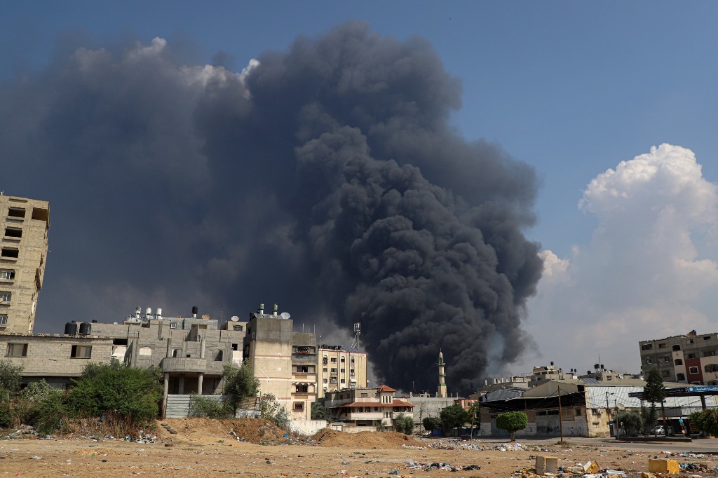 10月11日,加沙城的建筑遭以色列空襲后升起濃煙。新華社發(fā)(里澤克·阿卜杜勒賈瓦德攝)