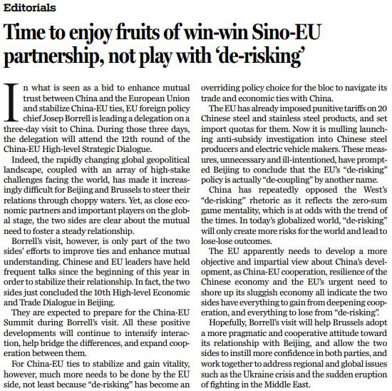 原文標(biāo)題:Time to enjoy fruits of win-win Sino-EU partnership, not play with ‘de-risking’