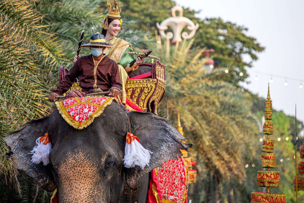 ↑演員在大城府街頭參加巡游活動慶祝宋干節(jié)