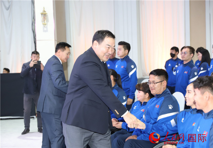 10月14日,巴特額爾登主席與運(yùn)動(dòng)員握手。人民網(wǎng)記者 霍文攝 |