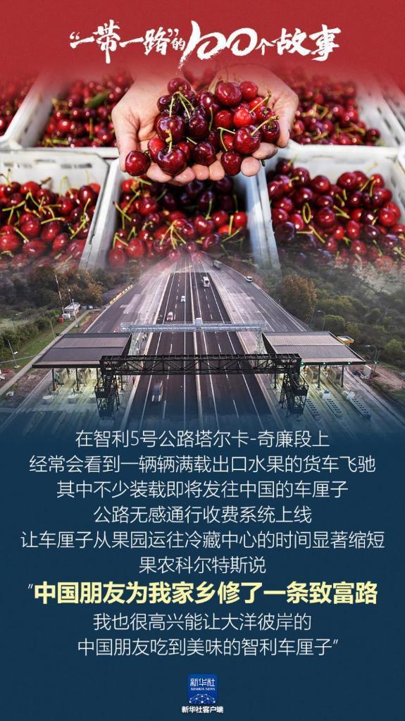 在智利5號公路塔爾卡-奇廉段上,經(jīng)常會看到一輛輛滿載出口水果的貨車飛馳,其中不少裝載即將發(fā)往中國的車厘子。公路無感通行收費系統(tǒng)上線,讓車厘子從果園運往冷藏中心的時間顯著縮短。果農(nóng)科爾特斯說:“中國朋友為我家鄉(xiāng)修了一條致富路,我也很高興能讓大洋彼岸的中國朋友吃到美味的智利車厘子。”(記者:朱雨博)
