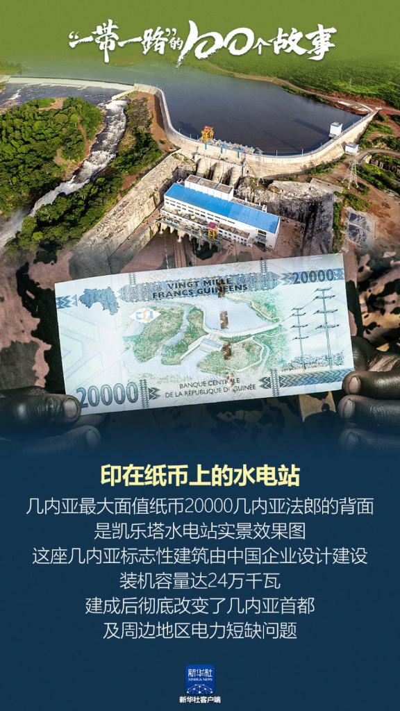 印在紙幣上的水電站。幾內(nèi)亞最大面值紙幣20000幾內(nèi)亞法郎的背面,是凱樂(lè)塔水電站實(shí)景效果圖。這座幾內(nèi)亞標(biāo)志性建筑由中國(guó)企業(yè)設(shè)計(jì)建設(shè),裝機(jī)容量達(dá)24萬(wàn)千瓦,建成后徹底改變了幾內(nèi)亞首都及周邊地區(qū)電力短缺問(wèn)題。(記者:鄭揚(yáng)子)