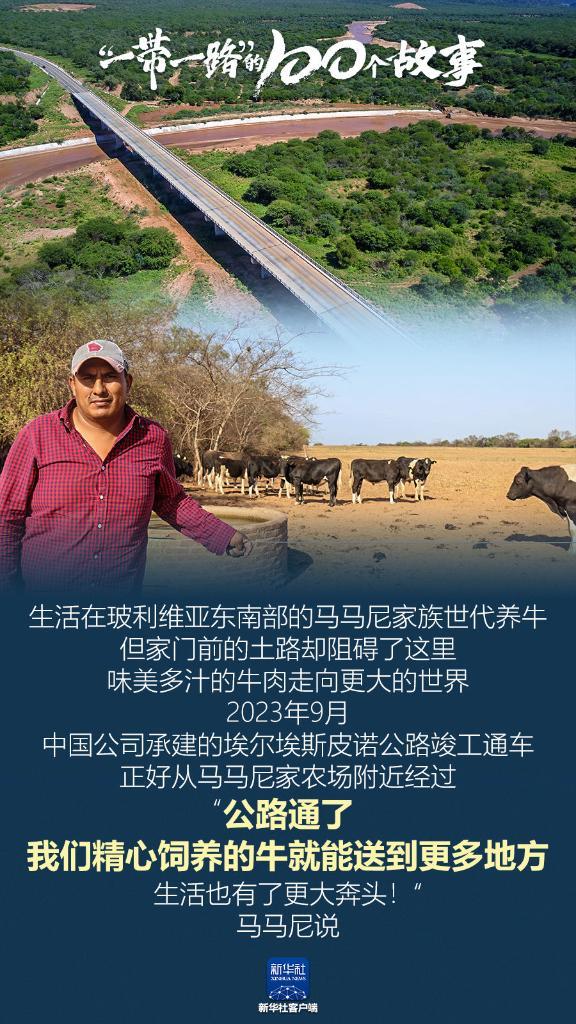 生活在玻利維亞東南部的馬馬尼家族世代養(yǎng)牛,但家門前的土路卻阻礙了這里味美多汁的牛肉走向更大的世界。2023年9月,中國公司承建的埃爾埃斯皮諾公路竣工通車,正好從馬馬尼家農(nóng)場附近經(jīng)過。“公路通了,我們精心飼養(yǎng)的牛就能送到更多地方,生活也有了更大奔頭!”馬馬尼說。(記者:郝云甫、吳昊)