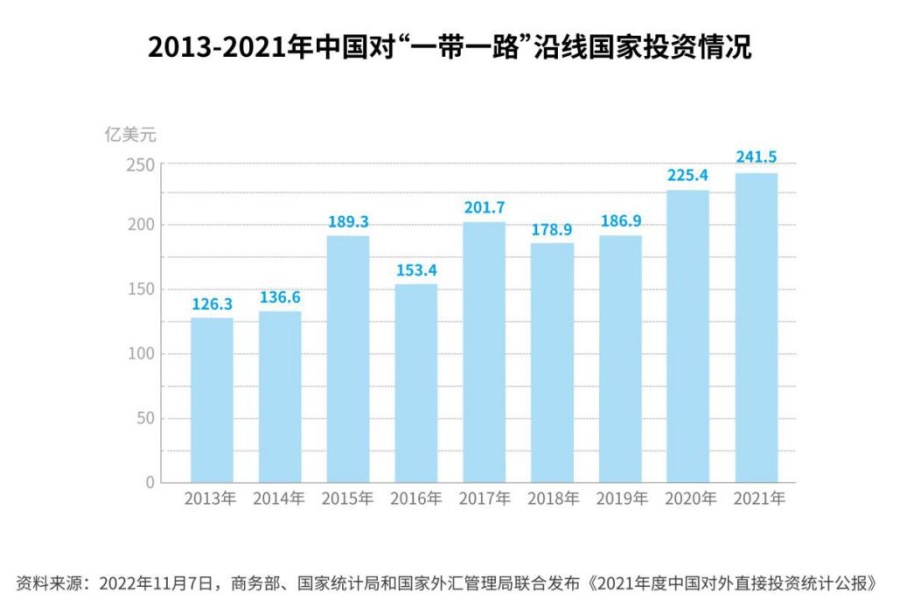 截至2021年底,中國在“一帶一路”沿線國家設立企業(yè)超過1.1萬家,約占中國境外企業(yè)總量的1/4。2021年,對“一帶一路”沿線國家直接投資241.5億美元,創(chuàng)歷史新高,占中國全年對外投資流量總額的13.5%;年末存量2138.4億美元,占存量總額的7.7%。[16]